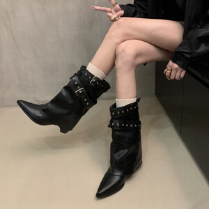 复古粗跟中筒靴女2025新款秋季百搭尖头西部牛仔靴皮带扣裤管靴子