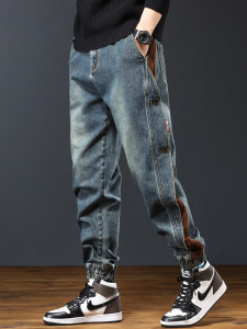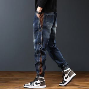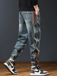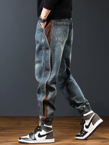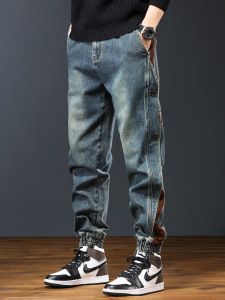 重磅拼接工装牛仔裤男宽松束脚美式高街裤子潮牌痞帅哈伦休闲男裤
