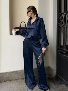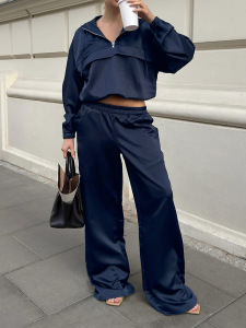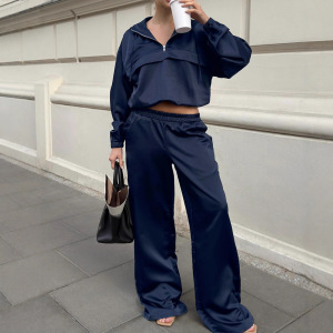 欧美复古设计感藏青色拉链polo衫长袖长裤两件套女抽绳仿真丝套装