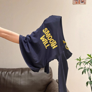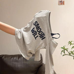 灰色字母斜肩印花收腰褶皱长袖T恤女早秋新款露肩高级感上衣批发