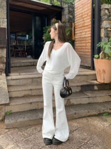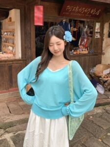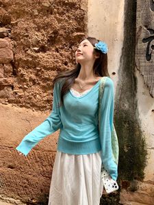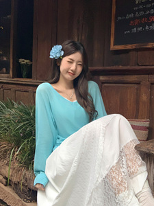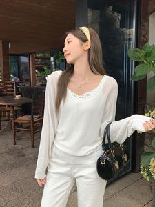 韩系白色打底衫内搭微透大v领t恤2025秋季宽松长袖针织收腰上衣女