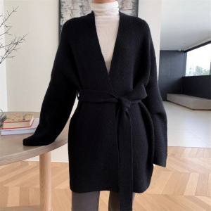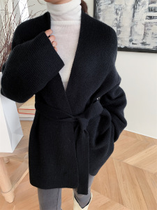 俄罗斯跨境欧美慵懒风毛衣外套秋冬新款风宽松系腰带针织开衫女
