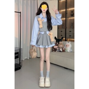 秋季韩版套装简约长袖衬衫收腰背心假两件高腰显瘦半身裙两件套女