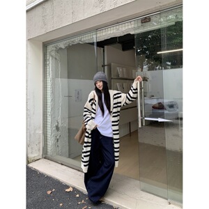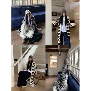 实拍 韩系条纹中长款毛衣开衫外套女秋冬慵懒风小众针织上衣88783