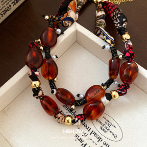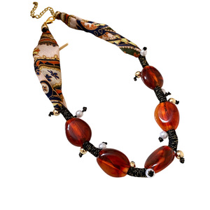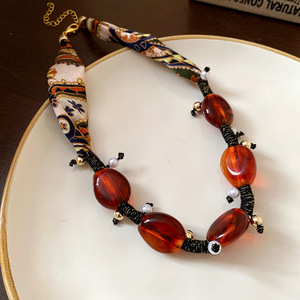 复古布料印花树脂串珠项链中古vintage锁骨链轻奢高级感项饰批发