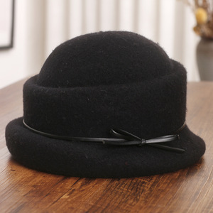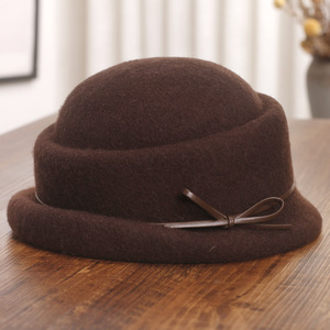 日系蝴蝶结卷边羊毛礼帽女秋冬季新款保暖毛呢盆帽优雅气质渔夫帽