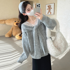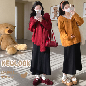 孕妇秋冬新款外穿花边领系带套头毛衣百搭直筒半身裙甜美显瘦套装