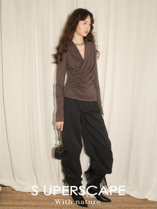 素舶 奥地利莫代尔羊毛混纺轻盈柔软透气v领堆褶收腰显瘦长袖上衣