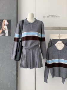 2025韩系学院风灰色polo领条纹针织衫女秋长袖毛衣上衣裙子套装