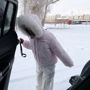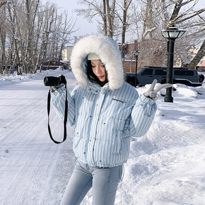 美式设计感条纹蝴蝶结毛领连帽棉服外套冬季加厚保暖棉衣女