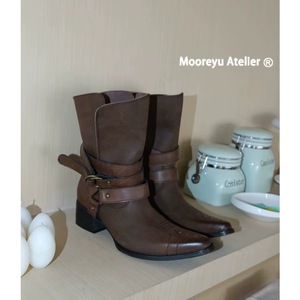 Mooreyu棕色尖头短靴女真皮刺绣西部牛仔靴做旧废土风中筒靴原创