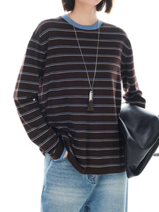 槿一【织梦】丝光羊毛混纺撞色条纹针织衫女2025秋季显瘦落肩上衣