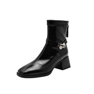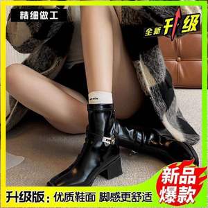 2025英伦风马丁靴女复古锁扣方头弹力瘦瘦靴棕色粗跟短靴