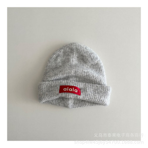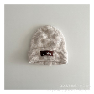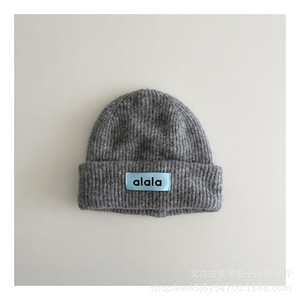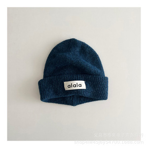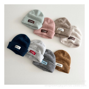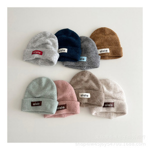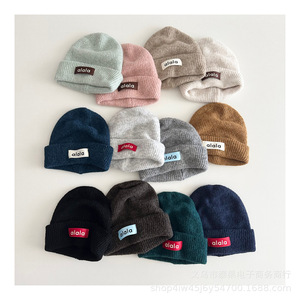韩版儿童新款简约彩标卷边纯色针织帽男女童冬季保暖护耳毛线帽子