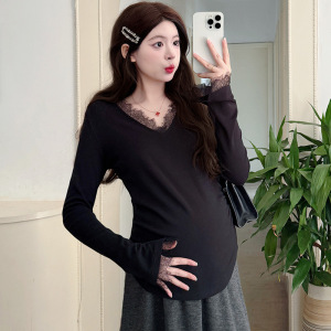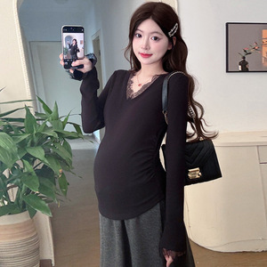 实拍孕妇长袖T恤衫打底衫秋冬内搭时尚显瘦修身弹力孕妇V领蕾丝衫