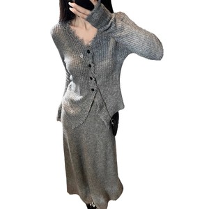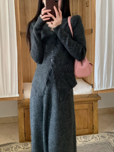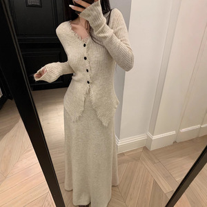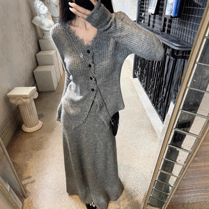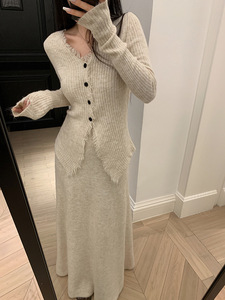 软糯温柔针织套装裙女士秋冬新款V领流苏上衣中长款半身裙两件套