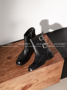欧洲站女鞋25冬时尚软软胎牛皮圆头舒适休闲款套筒切尔西平底短靴