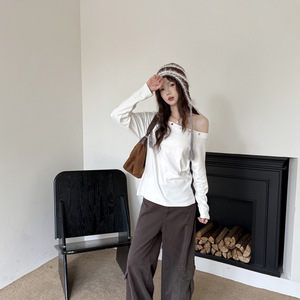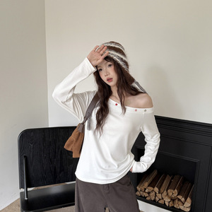 实拍#长袖T恤女2025新款秋装女款早秋斜肩露肩不规则上衣女
