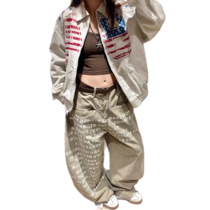 欧美字母印花卡其色牛仔裤女秋季设计感宽松垂感显瘦阔腿弯刀裤子