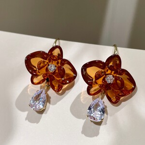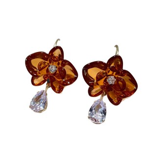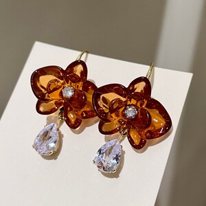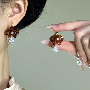 琥珀色花瓣水滴闪钻耳钉美拉德棕色花朵耳环闪锆耳扣高级感耳饰女