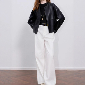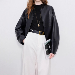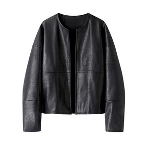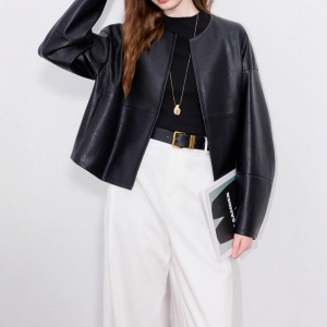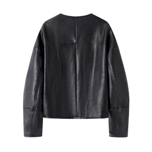 2025秋季新款皮衣PU外套荔枝纹黑色圆领宽松皮衣D403PS101W00