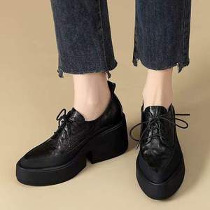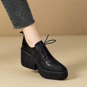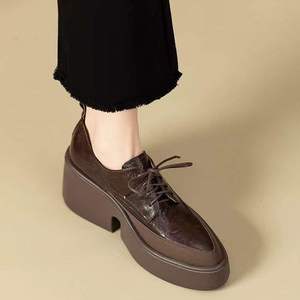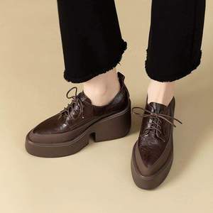 英伦风复古尖头系带小皮鞋女2025秋新款软皮单鞋女粗跟厚底乐福鞋