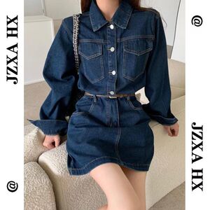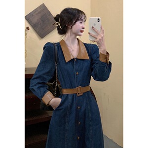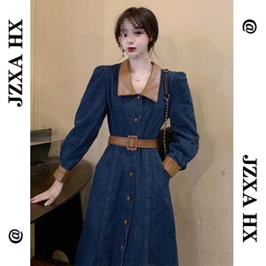 秋季温柔系穿搭掐腰连衣裙大码胖mm显瘦收腰长袖上衣牛仔裙中长款