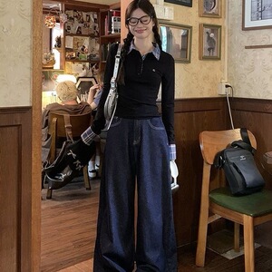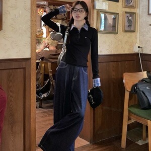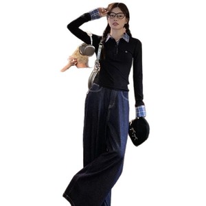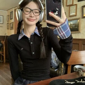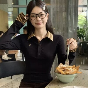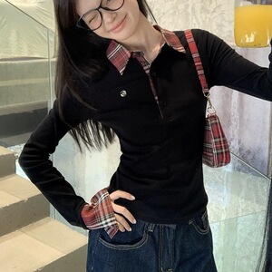 韩系polo领格子拼接长袖T恤女装秋季新款纽扣设计假两件修身上衣