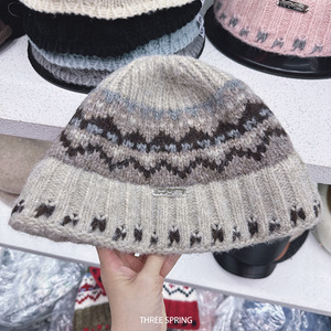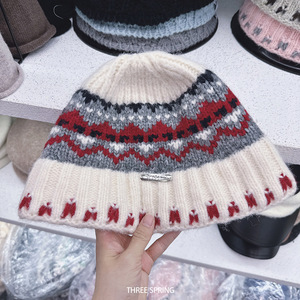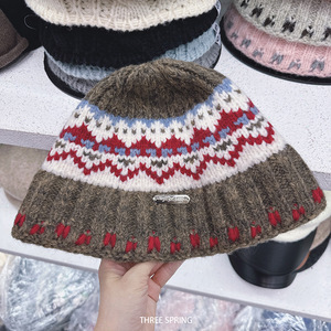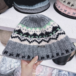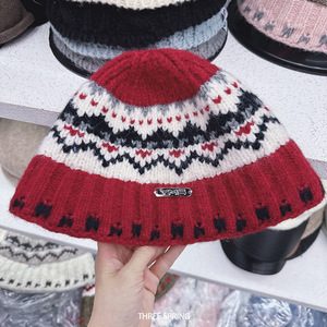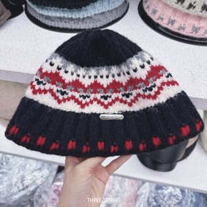 批发韩国2025年秋冬新款费尔岛风提花针织帽女大头围显脸小毛线帽