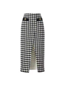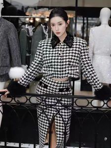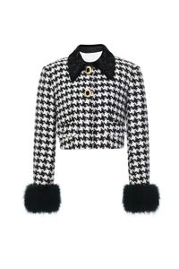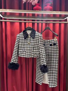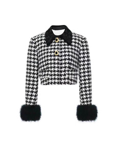 拉菲飞商场同款姆2025冬季摩登重工千鸟格钉珠拼接驼鸟毛外套女