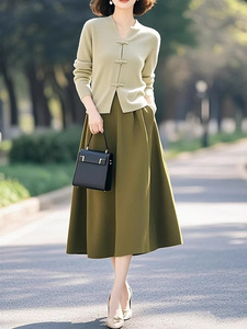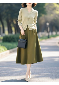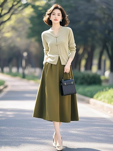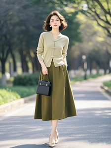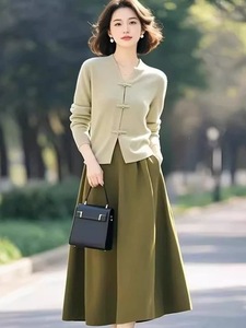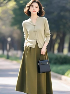 今年流行的针织套装女装秋冬季新款V领盘扣针织衫半身裙两件套