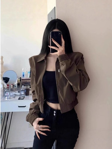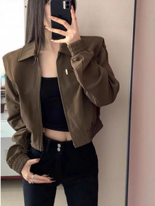 美式复古棕色短款外套女早春秋季高级感小个子宽松休闲夹克上衣潮