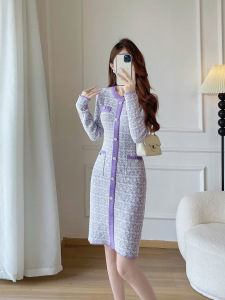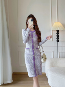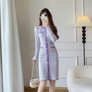 紫色小香风针织连衣裙女秋冬季新款洋气修身显瘦收腰A字毛衣裙子