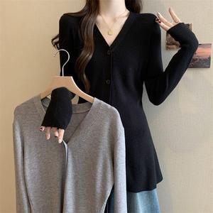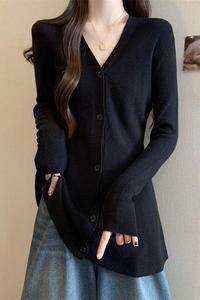 春秋新款针织衫女气质感V领宽松百搭中长款开衫内搭打底上衣