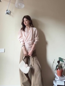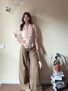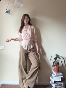 慵懒风粉色交叉绑带设计感衬衫女秋季收腰气质法式不规则长袖上衣