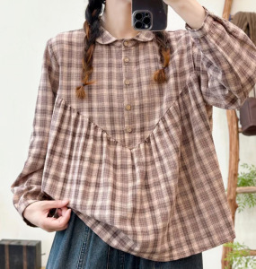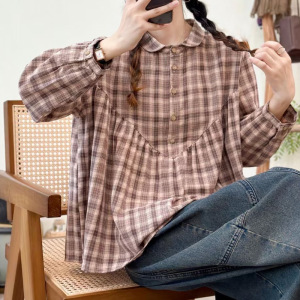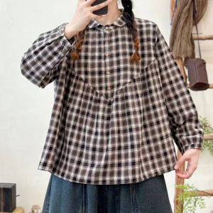 秋季女装新款森女系格子翻领宽松大码套头长袖衬衫女衬衣