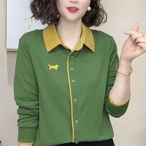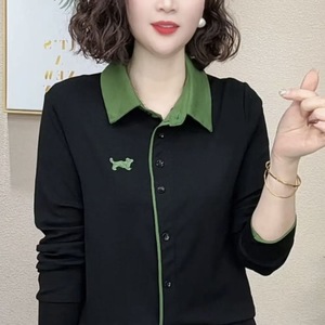 批发代发2025春秋季新款韩系翻领休闲刺绣狗狗百搭宽松撞色T恤女
