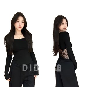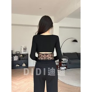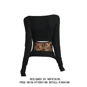 大码胖mm美式辣妹后背镂空蕾丝拼接长袖T恤女秋季修身显瘦上衣