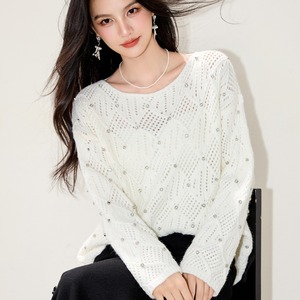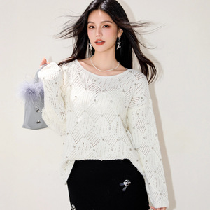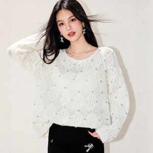 R5604气质2025年秋季韩版时尚钉珠镂空圆领套头宽松长袖毛衣上衣