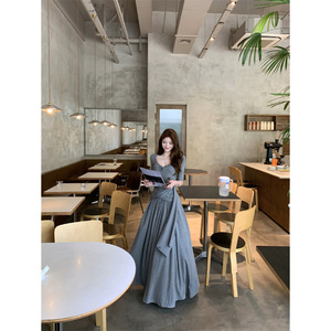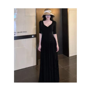 灰色扭结v领半袖连衣裙女夏季修身收腰休闲裙子设计感显瘦a字长裙