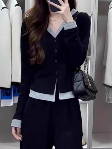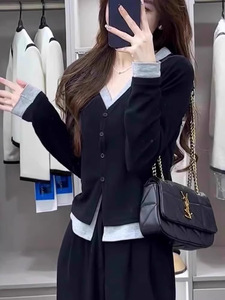 哥家商场同款女装2025秋季假两件V领长袖T恤女打底衫显瘦针织开衫
