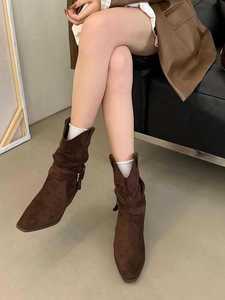 羊皮版~复古粗跟西部牛仔靴女2025冬新款显瘦增高短靴绒面堆堆靴