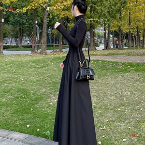 黑色赫本风高领连衣裙女2025秋装感收腰显瘦气质长裙大摆裙子