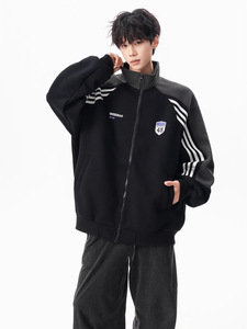 美式条纹撞色立领开衫卫衣男潮牌学院风宽松休闲百搭运动夹克外套