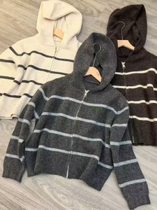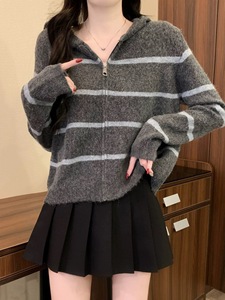 拉链连帽条纹撞色毛衣外套女2025秋冬新款休闲百搭慵懒风针织开衫