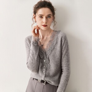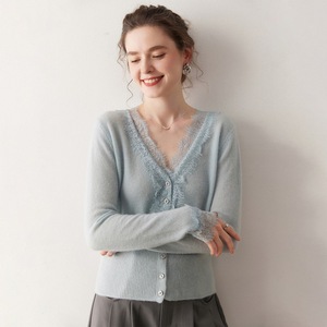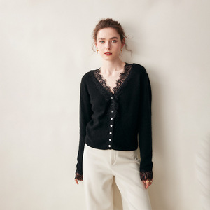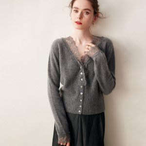 秋冬新款高级感羊绒衫女薄款山羊绒开衫蕾丝款V领针织羊绒外套