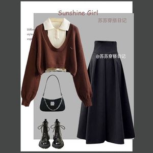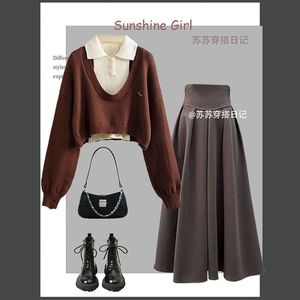 咖色毛衣+米杏打底+咖色半身裙 三件套