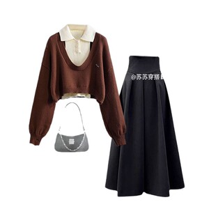 咖色毛衣+米杏打底+黑色半身裙 三件套