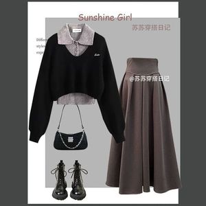 黑色毛衣+灰色打底+咖色半身裙 三件套