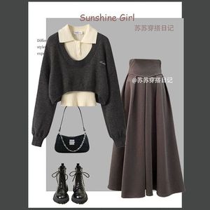 灰色毛衣+米杏打底+咖色半身裙 三件套